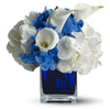 Beautiful Blue and White Table Settings of Hydrangea and Calli's in a 4x4 blue cube.