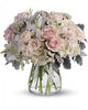 Peaceful pink and white roses, lilies and delicate Queen Anne's lace. with the freshest of the market's flowers in a simple, elegant vase.